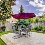 Beautiful Backyard With Trees And Stamped Concrete Patio.